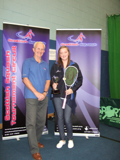 Kirsty Lobban was titled Under 15’s Scottish Junior Open Champion 2010 and she was the only Scot to achieve the honour at this years European Tour Event. Kirsty (pictured left with her Harrow racket, receives her winner’s trophy from SSq President Ron Pearman) did it in style, only dropping one game throughout the whole tournament and winning the final 3-0 against fellow Scot Claire Gadsby.