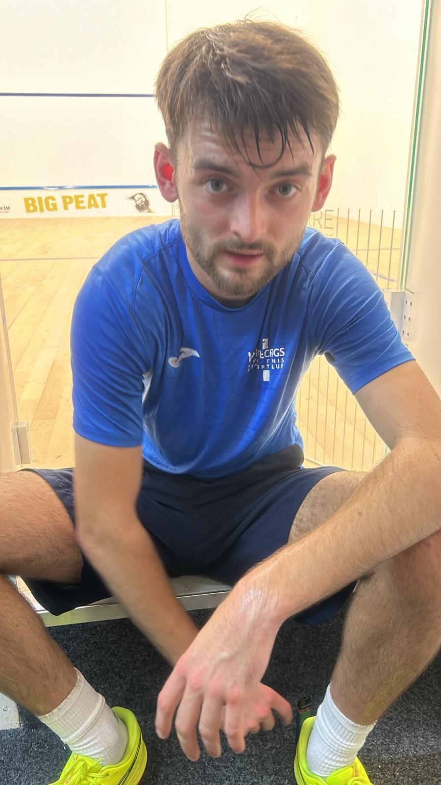 Next up was a man that has no lack of confidence, as the new Whitecraigs up-and-comer Alex Hardiman took on Kieran Martin at No.4. Alex’s warm up seemed to consist of vaping whilst chatting to his girlfriend! But fair play, as it got him going in the 1st game and despite a slow start (3-8 down) he came back to time his run to perfection and nick the 1st game 18-16. In comparison the next two games were much more straightforward, and Alex closed the match out 3-0, which is amazing for him as he normally likes to take his foot off the gas and play to the crowd! But not this time and another great performance with some lovely volleying (as well as some average ones!) especially a fantastic roller in the 3rd game to secure his second ever team win!