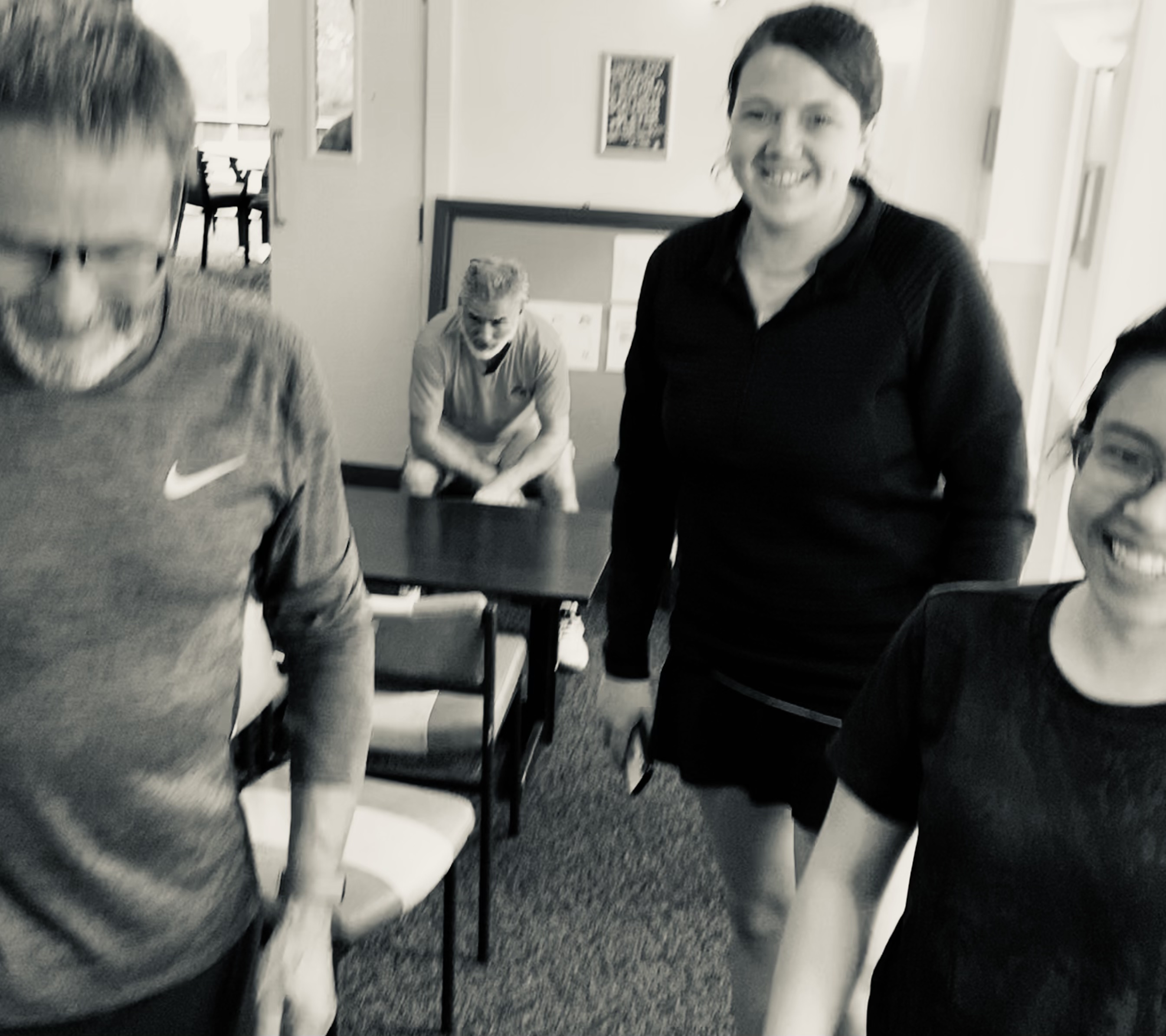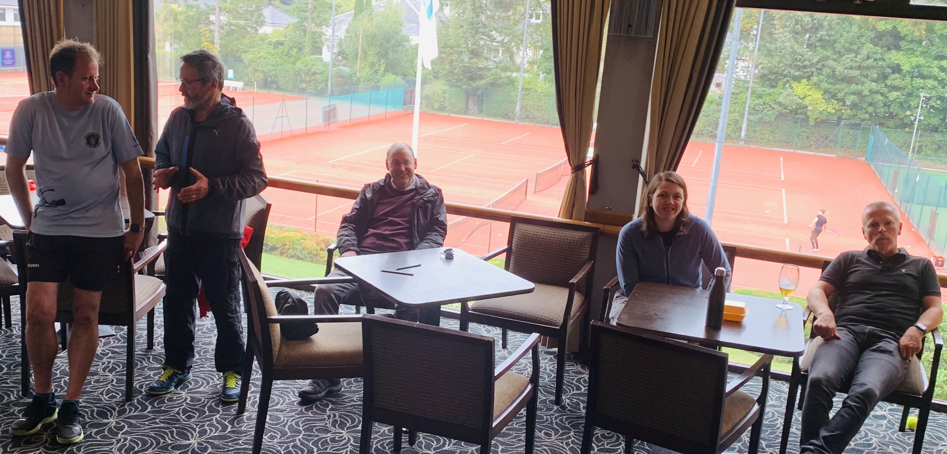 Cammy (Colquhoun) at No.3 and Chris (Murphy) at No.1 went on last and Cammy was back to his old tricks of stringing his match out to 5 games! To be fair his opponent Robin ‘the Riddler’ Ridley did make him hit lots of errors (including more shots into the sauna roof than I think I’ve ever seen!). However, the bottom line was that Cammy could cover 99% of anything Rob hit and so just needed to keep the rallies going, against a guy two and a half times his age! Eventually Cammy got the message ….. and got Robin tired, to bring home the 3-2 win (Ollie was watching and hoping Robin would take the fifth game so he could take-the-piss all the way home!).